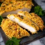 This Baked Buttermilk Chicken recipe features tender, juicy chicken breasts marinated in a flavorful buttermilk and garlic mixture, then coated with a crispy panko and parmesan crust, and baked to golden perfection. Perfectly seasoned with herbs and spices, this dish combines simple ingredients for a deliciously comforting meal.