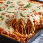 This classic Baked Ziti recipe features tender pasta baked in a rich, savory meat sauce combined with creamy ricotta, fresh basil, and a blend of mozzarella and Parmesan cheeses. Perfectly layered and baked until bubbly and golden, this comforting Italian-American casserole serves as a hearty main dish that’s ideal for family dinners or gatherings.
