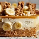 - Assemble the Cake: Place one banana cake layer on a serving plate. Spread half the banana pudding filling on top. Add the chilled cheesecake layer, then spread the remaining pudding filling. Top with the second banana cake layer. Frost the entire cake with cookie butter frosting. Decorate with crushed Biscoff cookies, banana slices, or whipped cream if desired. Chill for at least 1 hour before serving.