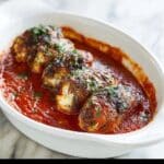 8. Serve: Remove the twine or toothpicks from each roulade. Slice into medallions if desired and serve hot with the rich tomato sauce spooned over the top.