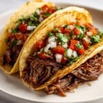 Fresh garnishes like chopped cilantro, diced onions, sliced radishes, or a squeeze of lime add brightness and contrast to the rich, savory beef carnitas. Don’t forget a dollop of sour cream or a sprinkle of crumbled cotija cheese for an extra indulgent touch.