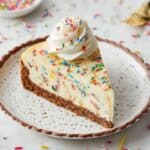 9. Serve: Carefully release the springform pan rim. Top the cheesecake with whipped cream and additional sprinkles if desired. Slice with a sharp knife and enjoy your festive birthday cake cheesecake!