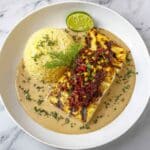 The dish shines with simple, fresh garnishes that brighten and balance the richness. Chopped green onions add a lovely crunch and vibrant green color, while a small wedge of lemon on the side allows diners to add an extra splash of citrus. You can also roll out a handful of fresh parsley or chives for a subtle herbaceous note if you like.