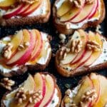 - Assemble the Crostini: Once the crostini are melted and golden, remove them from the oven. Top each with a slice or two of the prepared apples, sprinkle the chopped candied pecans evenly over the crostini, then finish with a generous drizzle of honey for sweetness and a glossy finish.