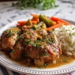 A flavorful and hearty Jamaican Brown Stew Chicken recipe featuring tender, seared chicken thighs simmered in a rich sauce of vegetables, herbs, and spices. This comforting dish is perfect served over rice or alongside your favorite vegetables, delivering a balanced combination of savory, sweet, and mildly spicy flavors.