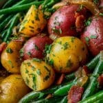 A flavorful Cajun-inspired dish featuring tender baby red potatoes and fresh green beans smothered in a savory onion and garlic sauce with crispy bacon and aromatic Cajun seasoning, perfect for a comforting side or vegetarian-adaptable meal.