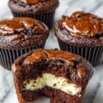 Indulge in these decadent Cheesecake Stuffed Chocolate Cupcakes, combining rich chocolate cupcake batter with a creamy cheesecake center. Topped with melted chocolate chips as a glossy frosting, these cupcakes offer a delightful contrast of flavors and textures, perfect for any celebration or dessert craving.