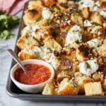 Remove from the oven and before serving, sprinkle the finished Cheesy Garlic Bread Nachos with freshly chopped parsley and sliced green onions for brightness and a pop of color. If you’re feeling adventurous, add some crushed red pepper flakes to bring a bit of fiery excitement to each bite. Serve these warm and watch them disappear fast!