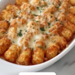 A comforting and hearty Chicken Alfredo Tater Tot Casserole combining tender shredded chicken in creamy Alfredo sauce, topped with crispy tater tots and a blend of melted mozzarella, cheddar, and Parmesan cheeses. Perfect for a family-friendly dinner that’s easy to prepare and bakes to golden perfection.