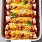 Delicious homemade Chicken Enchiladas featuring tender shredded chicken wrapped in soft corn tortillas, smothered in a flavorful homemade red enchilada sauce, and baked until bubbly with melted cheddar and Monterey Jack cheeses. This comforting Mexican-inspired dish is perfect for a family dinner and serves four.