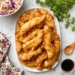 - Coat and Fry the Chicken: Quickly dip each marinated chicken strip into the batter to fully coat it. Allow excess batter to drip off before carefully placing several pieces into the hot oil.
