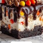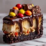 Indulge in this rich and creamy Chocolate Peanut Butter Candy Cheesecake, featuring a decadent chocolate cookie crust, smooth peanut butter-infused cream cheese filling, and a luscious chocolate ganache topping studded with peanut butter candies and chopped peanuts. Perfect for peanut butter and chocolate lovers looking for a show-stopping dessert.