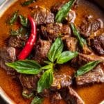 To reheat, warm the curry gently on the stovetop over low heat, stirring occasionally until heated through. If the sauce has thickened too much, add a splash of beef broth or coconut milk to loosen it back up. Avoid using high heat, which can dry out the beef or cause the coconut milk to separate.