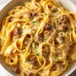 This Creamy Italian Sausage Fettuccine is a rich and flavorful pasta dish combining tender fettuccine with savory Italian sausage in a velvety Parmesan cream sauce. Perfect for a comforting weeknight dinner, it features aromatic garlic, sautéed onions, and a hint of Italian seasoning, all brought together in a luscious sauce that clings beautifully to every strand of pasta.