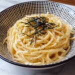 Creamy Mentaiko Pasta is a luscious Japanese-Italian fusion dish featuring spaghetti coated in a rich and flavorful sauce made from seasoned cod roe (mentaiko), heavy cream, butter, Parmesan cheese, and a hint of Japanese mayonnaise. Enhanced with garlic, lemon juice, and optional spice from red pepper flakes, this pasta offers a perfect balance of creaminess and umami with a delightful savory kick. Garnished with green onions and nori seaweed strips for an authentic touch, it’s a quick and satisfying meal that takes just 25 minutes to prepare and serves four.
