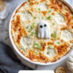 - Decorate for Halloween: For the spiderweb, pipe concentric circles of sour cream (optionally mixed with black food coloring) onto the warm dip. Use a toothpick to drag lines from the center outward to create a web pattern. For the ghosts, cut ghost shapes out of the white cheese slices using a cookie cutter, then arrange them on top of the dip. Add eyes with black decorating gel or small pieces of mini olives.