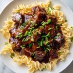 About 20 minutes before you’re ready to eat, prepare the egg noodles according to the package instructions. Once cooked, drain them well and set aside. Cooking noodles toward the end ensures they’re perfectly tender and ready to soak up all that delicious beef gravy.