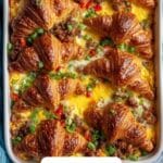 A delicious and hearty Croissant Breakfast Casserole combining buttery croissants, savory bacon or sausage, and a rich blend of cheddar and mozzarella cheeses, all soaked in a flavorful egg custard and baked to golden perfection. Ideal for a make-ahead brunch or holiday breakfast, this casserole is easy to customize and serves 8 generously.