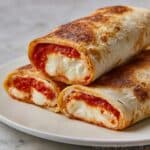 Lay each warmed tortilla flat and spoon about a tablespoon of pizza sauce at the bottom edge. Layer 5 slices of pepperoni over the sauce, then place the halved string cheese strips on top. Carefully roll everything up tight, making sure the seam is underneath to keep it sealed during cooking.