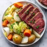 When everything is out of the oven, let the corned beef rest for 10 minutes before slicing against the grain. This resting period lets the juices redistribute so each slice is moist and tender, ready to be enjoyed as the centerpiece of your meal.