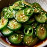 A refreshing and spicy Korean cucumber salad, known as Oi Muchim, featuring thinly sliced cucumbers tossed in a vibrant dressing of rice vinegar, soy sauce, gochugaru, and sesame oil. This easy no-cook side dish is perfect for Korean BBQ, rice bowls, or as a light appetizer.