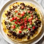 - Finish and Serve: Remove the Mexican pizzas from the oven and top with fresh diced tomatoes and chopped green onions. Serve immediately while hot and enjoy the crispy, cheesy, and flavorful experience.