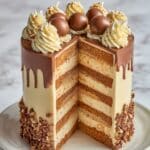 This decadent Ferrero Rocher Cake combines moist hazelnut and cocoa-flavored layers with a rich Nutella buttercream, decorated with crunchy crushed wafers and hazelnuts. Perfect for special occasions or chocolate lovers, it delivers a delightful blend of textures and flavors inspired by the famous Ferrero Rocher chocolates.