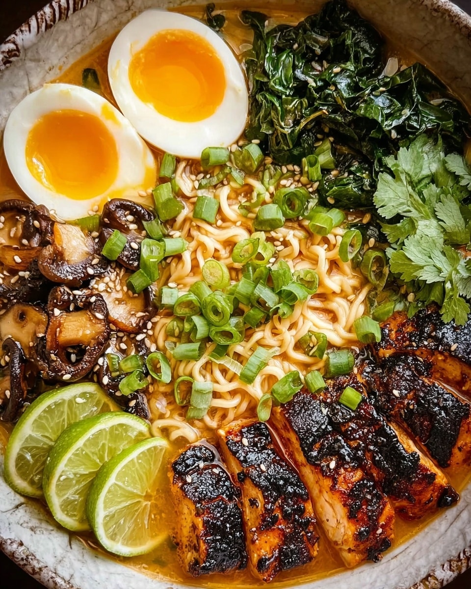 Enhance your bowl with fresh garnishes like crisp green onions, nutty sesame seeds, and soft-boiled eggs. A wedge of lime is essential for that pop of acidity which balances the richness and heat of the soup beautifully.
