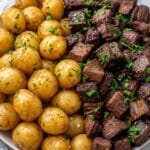 You can chop the potatoes and season them ahead of time, and even prepare the garlic butter sauce in advance. Just keep everything refrigerated and wait to sear the steak and roast the potatoes until you’re ready to eat for best results.