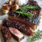 This Garlic Butter Steak recipe delivers juicy, tender NY Strip steaks infused with rich garlic and herb butter. The steaks are seasoned and marinated in a flavorful garlic butter mixture, then seared to perfection in a cast iron skillet. The final basting with melted herb butter enhances the crust and elevates the taste, making it ideal for a quick yet indulgent meal.