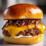 Cook each smashed patty for 2 to 3 minutes until crispy brown edges form, then flip carefully. Immediately add a slice of cheese on top of each patty and spoon a generous amount of those caramelized onions on top. Let the cheese melt for about 1 to 2 minutes while the burger finishes cooking.