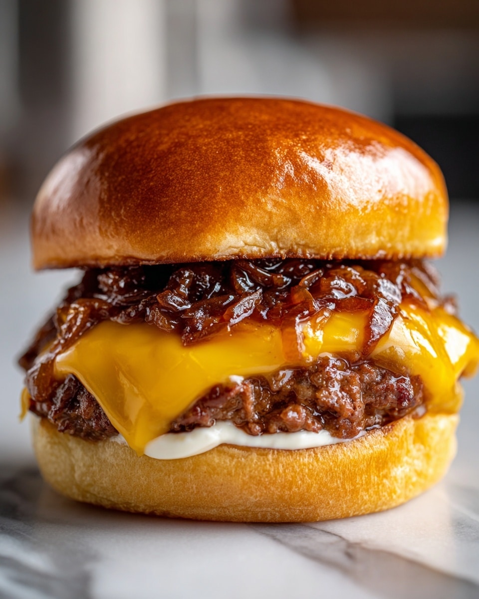 Cook each smashed patty for 2 to 3 minutes until crispy brown edges form, then flip carefully. Immediately add a slice of cheese on top of each patty and spoon a generous amount of those caramelized onions on top. Let the cheese melt for about 1 to 2 minutes while the burger finishes cooking.
