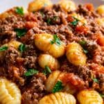 - Combine and Serve: Mix in the crumbled browned beef and seared gnocchi with the sauce. Toss to combine and warm through, then serve hot, garnished with grated Parmesan cheese and fresh parsley, if desired.