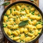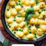 A creamy and comforting vegan gnocchi recipe featuring a rich dairy-free cream sauce infused with fresh sage, garlic, and white wine, complemented by tender peas and topped with vegan Parmesan for a deliciously indulgent yet plant-based meal.