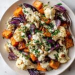 This Harissa Roasted Vegetables recipe offers a vibrant and flavorful combination of cauliflower, sweet potatoes, red onion, and carrots coated in a spicy harissa and olive oil blend. Roasted to perfection with an aromatic mix of spices, this dish brings a spicy and smoky depth to your roasted vegetable lineup, perfect as a wholesome side for any meal.