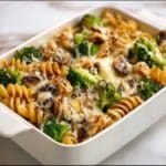 This Healthier Broccoli Chicken Casserole combines whole-wheat rotini, fresh broccoli florets, tender chicken, and a flavorful mushroom sauce made with sautéed vegetables and sharp cheddar cheese. Baked to perfection, this wholesome casserole offers a comforting and nutritious meal that balances protein, fiber, and rich flavors while using healthier ingredients like whole-wheat pasta and olive oil or butter alternatives.