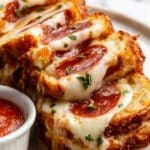 Let the stromboli rest for a few minutes after baking before slicing. Serve it warm with some classic pizza or marinara sauce on the side for dipping and watch as everyone falls in love bite after bite.