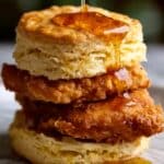 Crispy fried chicken cutlets nestled inside warm, flaky homemade biscuits, drizzled with a spicy-sweet hot honey sauce. This easy-to-make recipe combines tender buttermilk-marinated chicken, fluffy biscuits baked to golden perfection, and a vibrant hot honey drizzle for the perfect balance of flavors and textures in a comforting Southern-inspired sandwich.