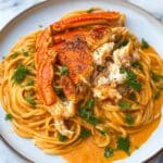 This King Crab Pasta with Tomato and Ouzo Sauce is a delightful Mediterranean-inspired seafood dish featuring tender king crab meat tossed in a creamy tomato and ouzo-infused sauce, served over perfectly cooked spaghetti or linguine. The vibrant flavors of fresh cherry tomatoes, garlic, shallots, and a touch of anise from the ouzo create a rich, indulgent pasta experience that’s quick to prepare and sure to impress.