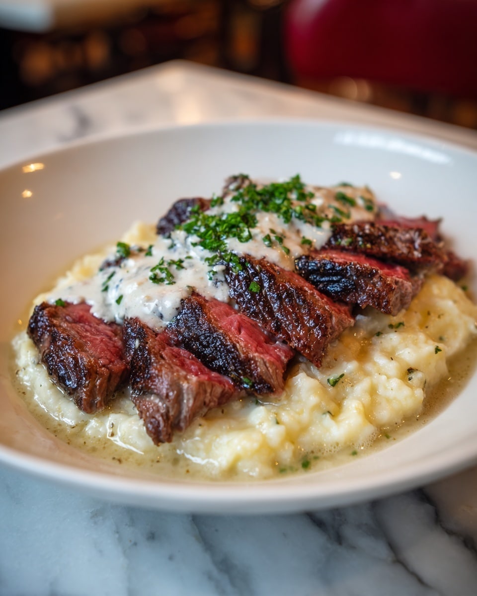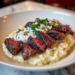 In a separate pan, melt more butter and sauté additional garlic until fragrant. Slowly whisk in the heavy cream and let it simmer gently for three to five minutes, allowing it to thicken slightly. Stir in freshly grated parmesan, minced parsley, and a squeeze of lemon juice. This sauce is where the magic happens—it’s creamy, tangy, and cheesy all at once, balancing the robust steak and tender potato perfectly.