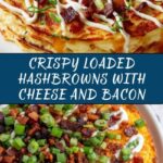 Finally, generously top your cheesy hashbrowns with cooked, crumbled bacon and fresh chopped green onions. Serve immediately while warm, ideally with a side or dollop of cool sour cream to balance all those savory flavors.