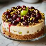 The topping cherries and pistachios already make this cheesecake a showstopper, but you can elevate it further by adding a few fresh mint leaves for a pop of green or a light dusting of powdered sugar for a delicate sparkle. A thin lemon or lime twist curled on top also adds an elegant citrus flourish that instantly ups the presentation.
