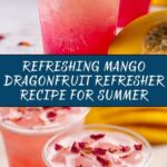 A vibrant and refreshing Mango Dragonfruit Refresher recipe that blends homemade dragon fruit syrup with mango nectar and a hint of citrus, served chilled over ice and garnished with freeze-dried dragonfruit pieces for a tropical burst of flavor.