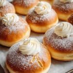 Whip the heavy cream together with powdered sugar until it forms stiff peaks—that soft, cloud-like texture that’s the hallmark of a perfect whipped cream. Carefully slice each bun almost through the middle, creating a pocket, and fill generously with the luscious cream. Finally, dust with a little extra powdered sugar for that classic, delicate finish.