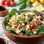 This Mediterranean Quinoa Salad with Feta Recipe is grounded in simple, wholesome ingredients that come together effortlessly. Each component plays its own unique role — quinoa offers a light, nutty base; fresh veggies add crunch and brightness; olives bring a touch of salty richness; and feta crowns the salad with creamy tang. The dressing ties everything together with zesty, herbaceous notes that make this dish pop.