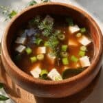 This classic Japanese Miso Soup recipe features a rich umami broth made from dashi and miso paste, combined with tender tofu, rehydrated wakame seaweed, fresh mushrooms, and sliced green onions for a comforting and flavorful starter or light meal.