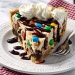 - Garnish and serve: Before serving, garnish the pie with extra mini M&M’s, chocolate chips, and whipped cream if desired for extra flavor and visual appeal. Slice and enjoy!