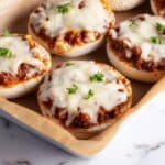 Carefully split your buns or English muffins and lay each half face-up on the prepared baking sheet. Spoon about ⅓ cup of the saucy meat mixture evenly onto each bun half, then generously top each with 2 to 3 tablespoons of shredded mozzarella cheese. This layering is where these pizza burgers start looking like the magic they are.