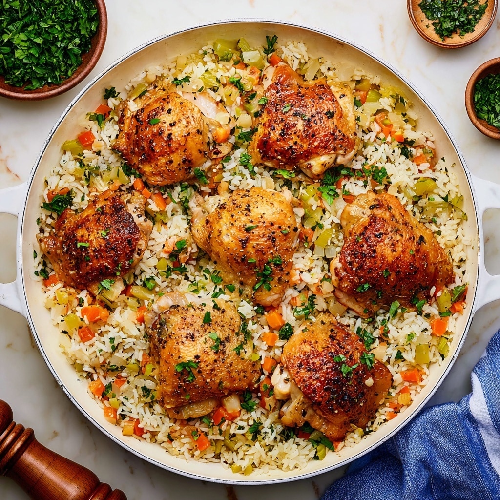 A comforting and flavorful one-pan chicken and rice bake featuring tender chicken thighs cooked atop a savory bed of garlic-infused rice and mirepoix, all baked to perfection with buttery accents for a simple, satisfying meal.
