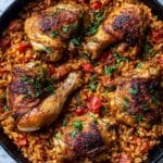 Reheat leftovers gently on the stovetop or in the microwave until piping hot. Adding a splash of chicken broth or water can help loosen the rice if it’s absorbed too much liquid. For crispy skin after reheating, consider popping the chicken under the broiler for a couple of minutes to bring back its crunch.